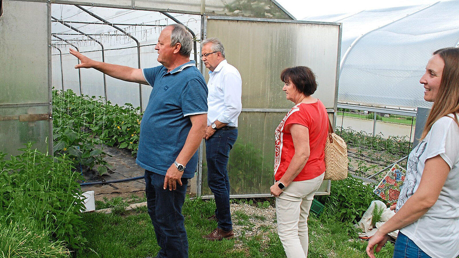 Helmut Ettl (links) weist auf Hopfenpflanzen und Brennnesseln neben der Gewächshaustür hin. Interessiert hören ihm Kreisfachberaterin Simone Schmitt, OGV-Kreisvorsitzende Monika Edenhofer und Landrat Josef Laumer (von rechts) zu.