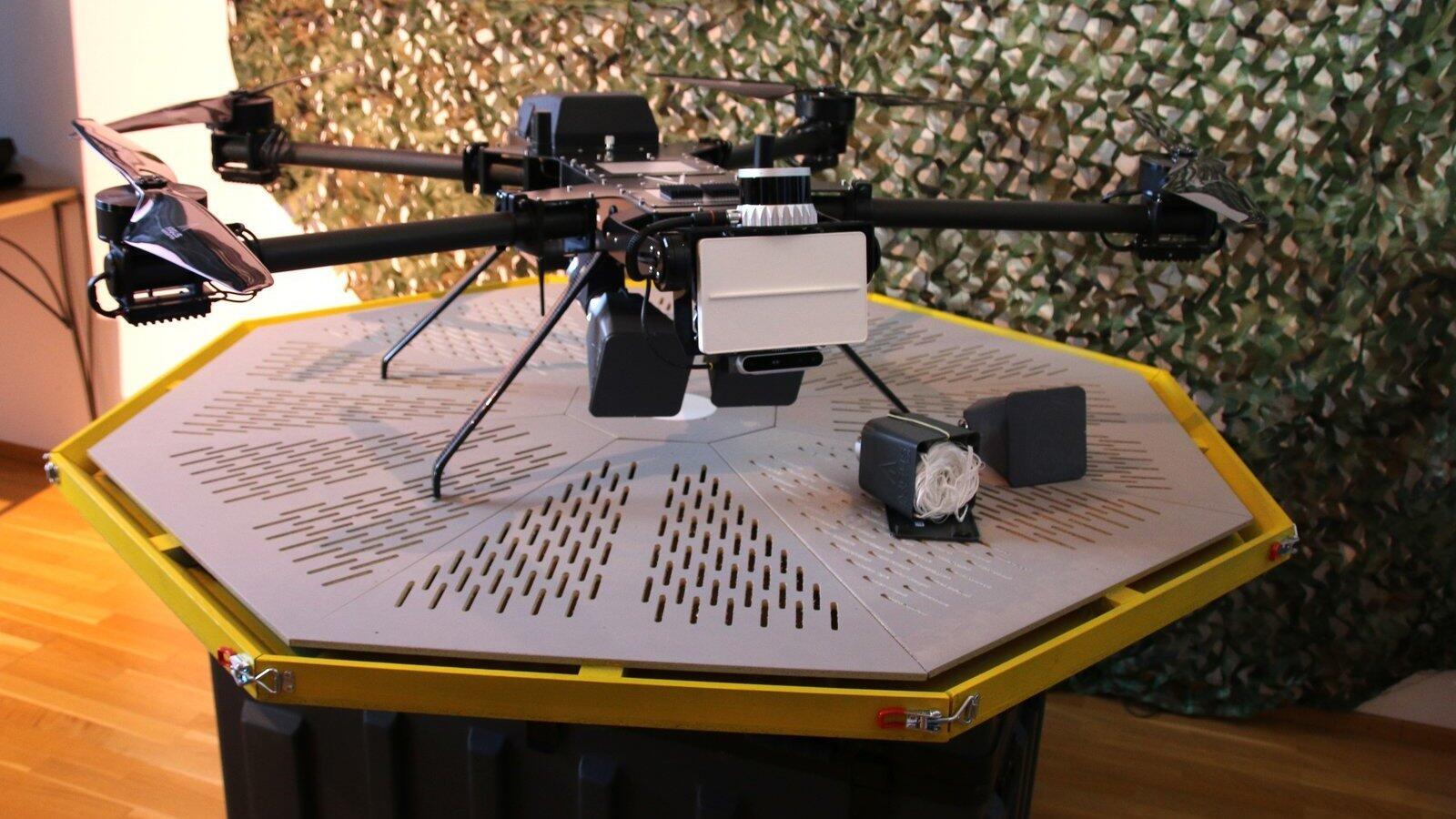 Eine Landeplattform der Firma Härtenberger für hochwertige Drohnen, dargestellt mit der Abfangdrohne der Firma Argus-Interception.