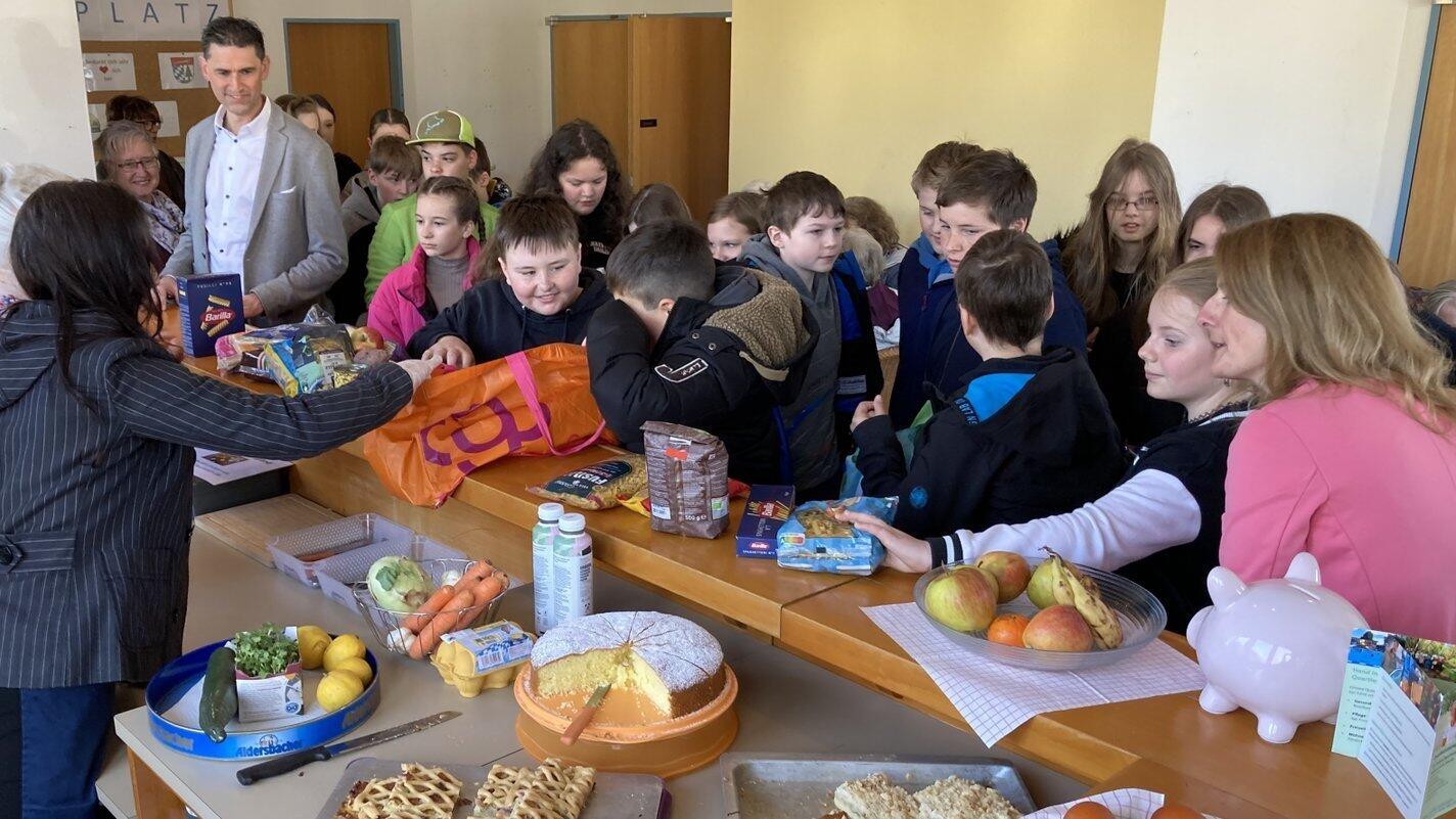 Sie brachten richtig Leben in den "Marktplatz Mitterfels": Die Schüler der Klasse 6a der Mittelschule brachten ihre Lebensmittelspenden höchstpersönlich vorbei.