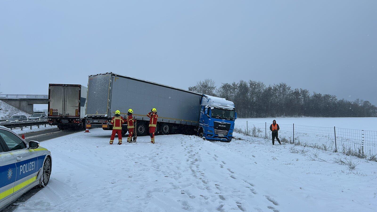 Wegen Schneeglätte ist ein Lastwagen von der Fahrbahn der A 3 gerutscht. Verletzt wurde niemand, Einsatzkräfte der Freiwilligen Feuerwehr wurden zur Absicherung mit eingesetzt.