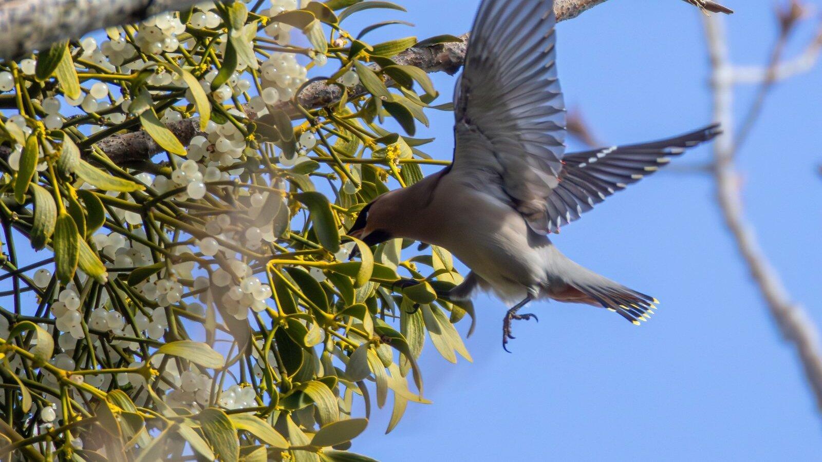 Ein Seidenschwanz, der im Flug eine Mistel besucht: Die seltenen Wintergäste laben sich an den Früchten des Halbschmarotzers.