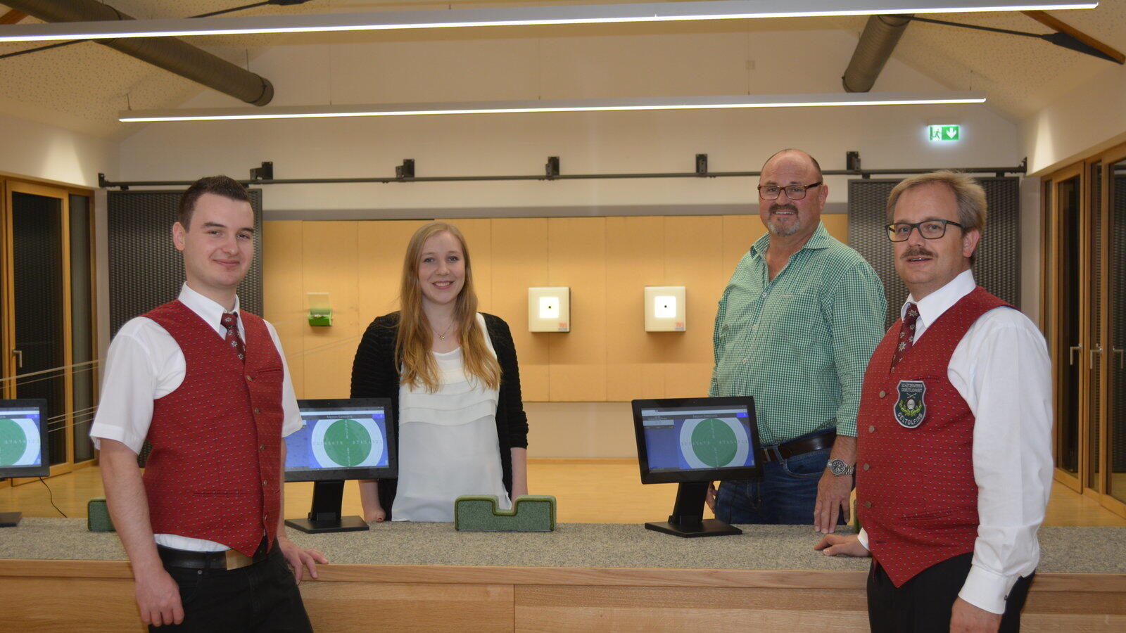 Die Vorstandschaft mit Alexander Heinrich, Karlheinz Zollner und Reiner Mittig (v. l.) und Kassier Theresa Heinrich vor den neuen Schießständen.