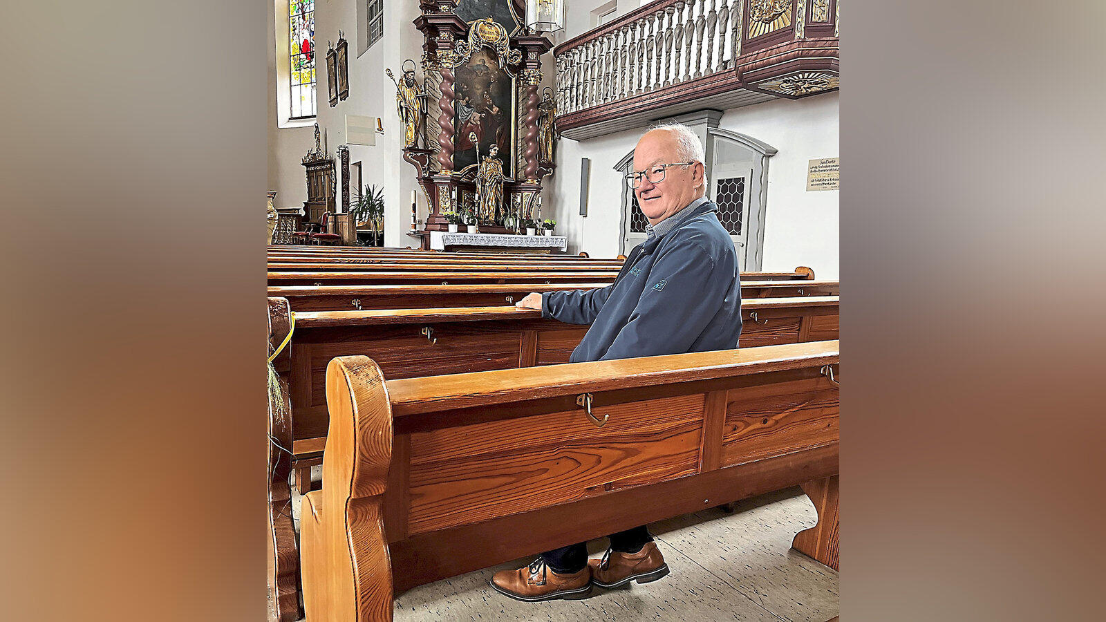Xaver Gilch auf seinem Stammplatz in der Kirche Sankt Wolfgang. Früher hat er bei der Sparkasse gearbeitet, war stellvertretendes Vorstandsmitglied.