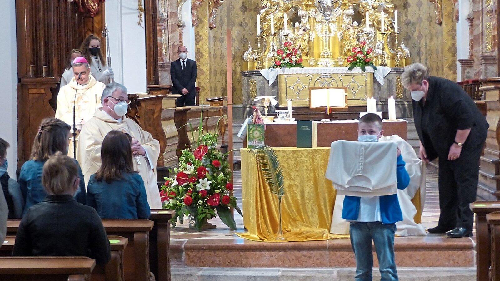 Die diesjährigen Kommunionkinder trugen im Gottesdienst die Fürbitten vor und zeigten dabei Symbole zum Leben des heiligen Norbert wie hier das weiße Ordensgewand. Der Ordensgründer Norbert von Xanten wird seit 1582 als Heiliger verehrt.