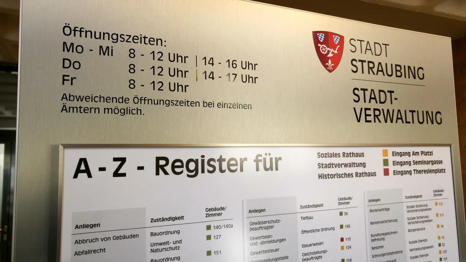 Die Aktualisierung des rathausinternen Wegweisers soll die Lage entschärfen. Die Stadt Straubing kündigt außerdem an, den Eingang zum Rathaus in der Seminargasse besser zu beschildern. Die Umzeunung der Gerüstanlage am Theresienplatz soll zu diesem Zweck umgestaltet werden. Noch vor den Sommermonaten sollen die zugänglichen Bereiche wieder ein geordnetes Erscheinungsbild bieten.