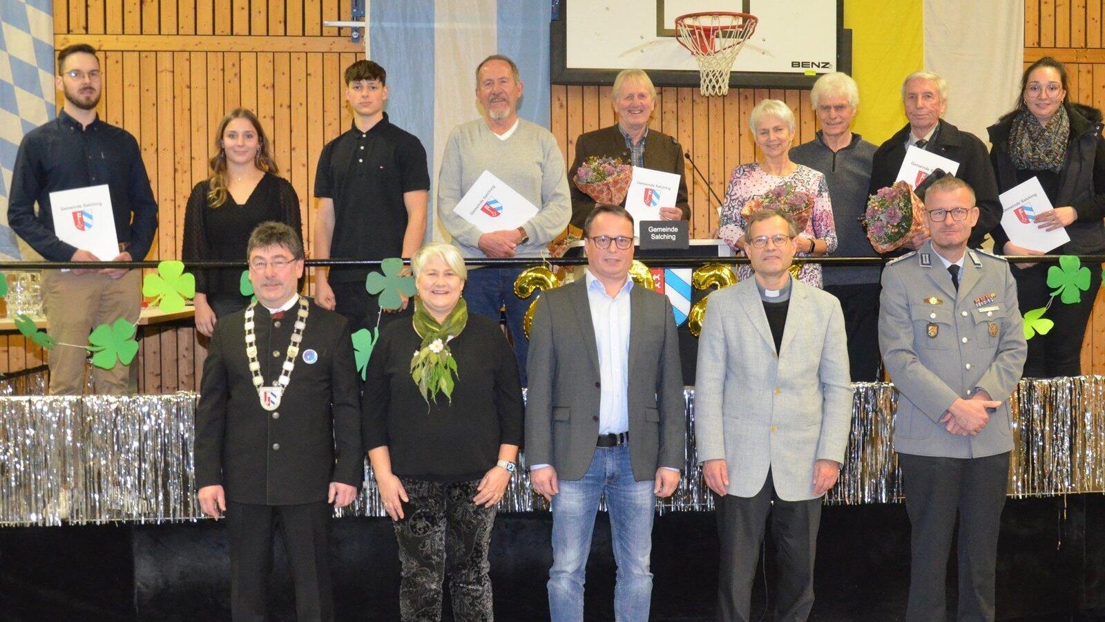 Die für sportliche Bestleistungen und ehrenamtliche Tätigkeit geehrten Gemeindebürger sowie (vorne von links): Bürgermeister Alfons Neumeier, 2. Bürgermeisterin Petra Grießbaum, 3. Bürgermeister Roland Plendl, Pfarrer Heinrich Weber und Hauptmann Daniel Löbens (Chef der Patenkompanie der Gemeinde Salching.