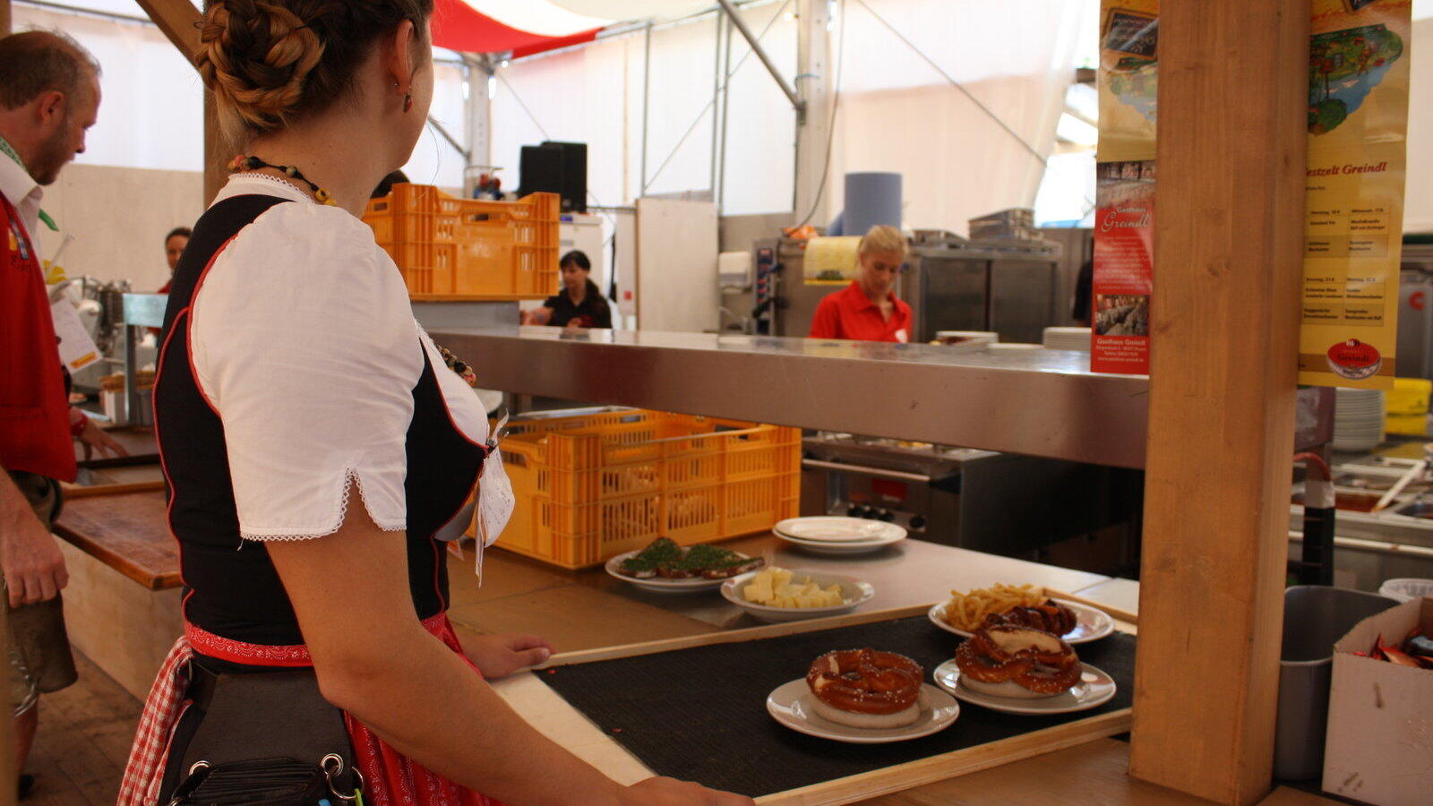 „Geh’ in die Hocke, Rücken gerade, greif’ mit der linken Hand vorne am Rand, mit der rechten Handfläche unten in die Mitte des Schlittens“, sagt Andrea und schiebt das knapp einen Meter lange Holztablett von der Essensausgabe auf meine rechte Schulter. „Jetzt durchstrecken“, sagt und sie und lächelt – und plötzlich stemme ich mehrere Teller mit Gickerl, zwei Kinderportionen Pommes mit Ketchup und einen Obazdn mit Volksfest-Brezen.