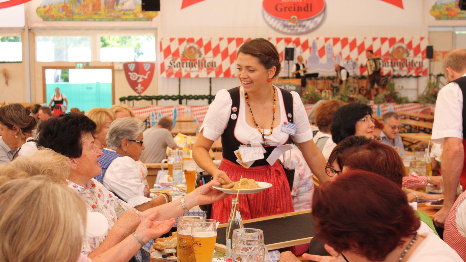 Es ist aber eine andere Sache, Brotzeitbrett und Kaiserschmarrn an der Essensausgabe einzusammeln, währenddessen die Getränke in der Schenke zu ordern und gleichzeitig immer das Besteck aufzufüllen, leere Krüge wegzubringen, Teller mit Essensresten in die Küche zu tragen – und dabei noch von einem Gast am Rockzipfel gezogen zu werden, der doch noch gerne eine Maß hätte.