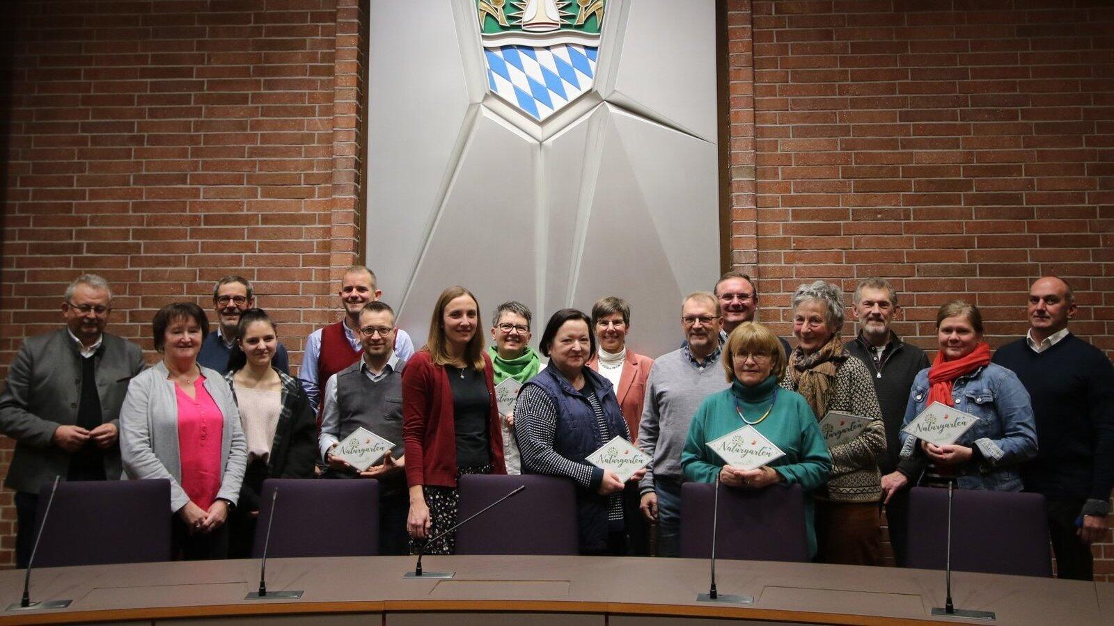 Die ausgezeichneten Naturgartenbesitzer: Annette Baumann, Birgit und Thomas Bauer, Bernadette und Manfred Fries, Eva und Erich Hager, Martin Hahn, Ursula und Stefan Heller, Dominik Hofegger und Sebastian Ehrl, Elisabeth Pongratz, Manfred Schreiner und Sven Stoltenberg mit landrat Josef Laumer (l.) und Kreisfachberaterin für Gartenkultur und Landespflege, Simone Schmitt (7. v. l.)