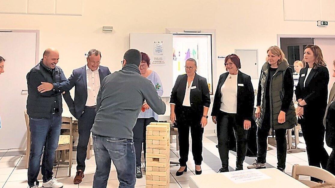 Zur Eröffnung spielten die Ehrengäste ein Jenga-Stapelspiel. Bürgermeisterin Andrea Probst (l.) ist Schirmherrin der Spieletage.