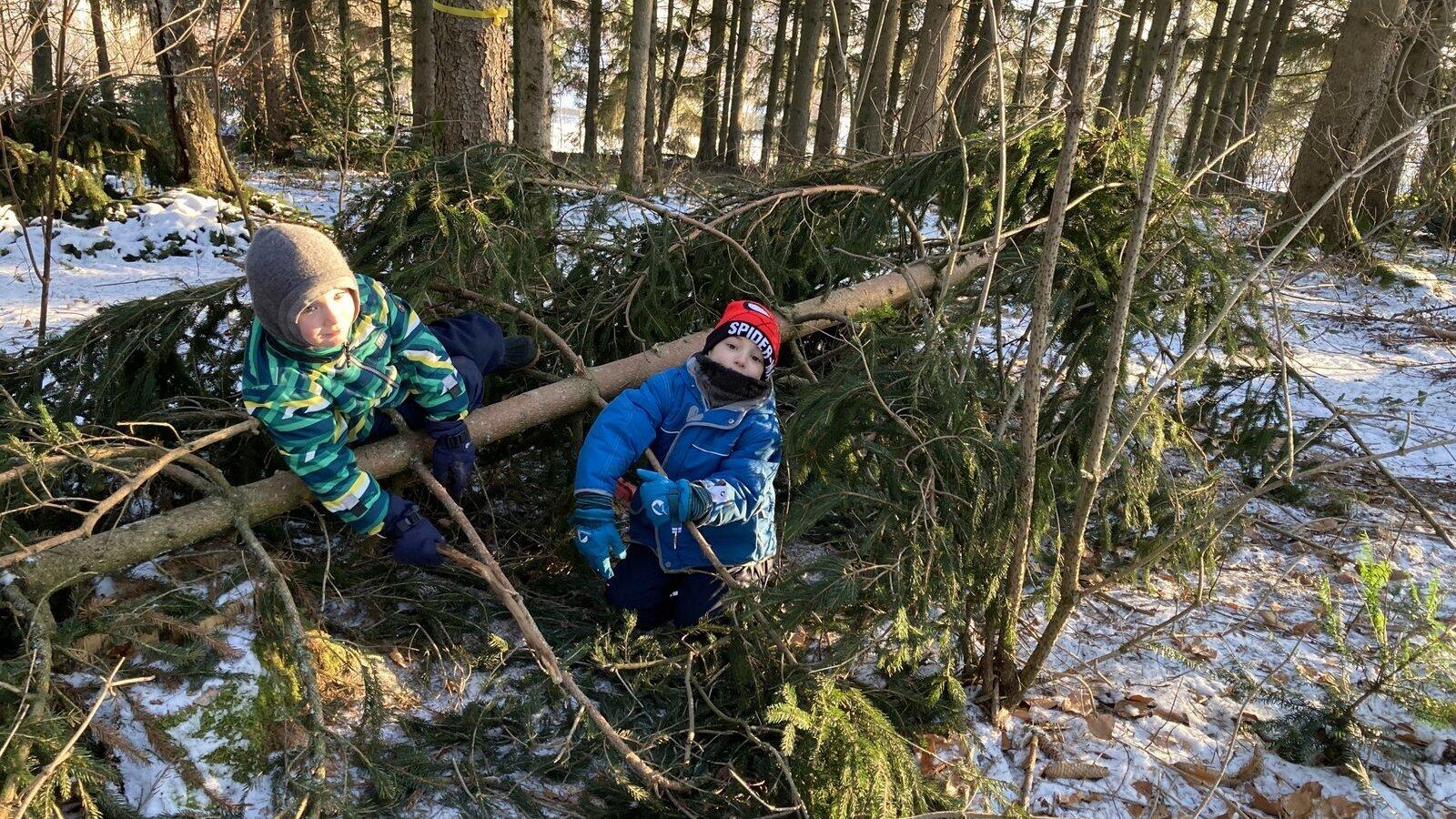 Dem Schneebruch sei Dank: Der Gipfel einer Fichte dient den beiden Buben als Piratenschiff.