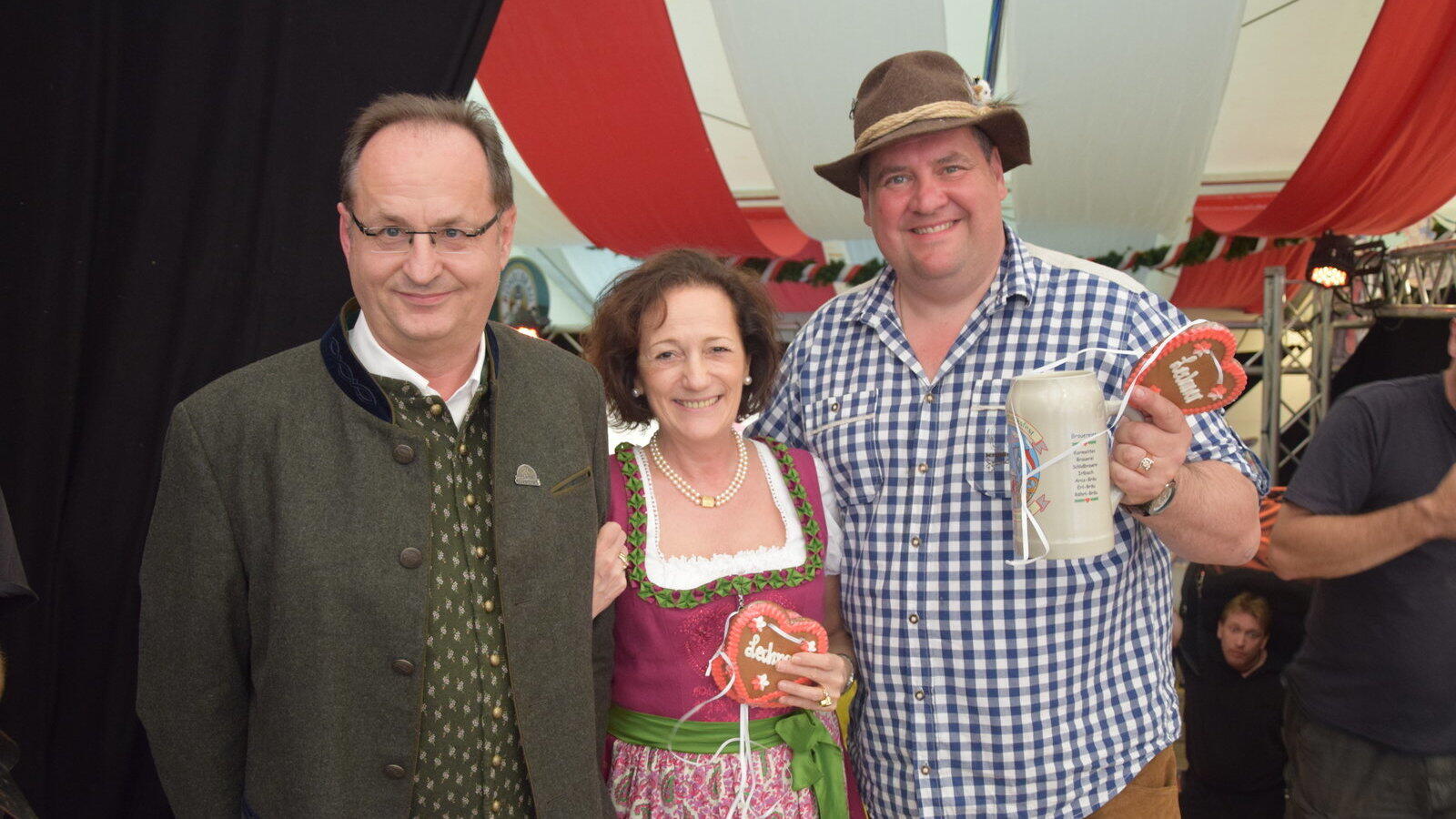 Jimmy James (rechts) beim Besuch im Festzelt Lechner mit Festwirt Martin Lechner (links) und dessen Frau Edith.