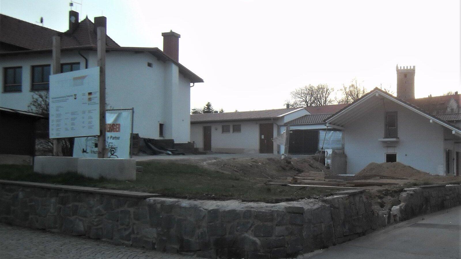 Ebenfalls der für den Abbruch vorgesehene Gebäudeteil (links im Bild) und zudem das Gebäude (ganz rechts) in dem die Heizungsanlage zur Nahwärmeversorgung, das neue Dorfgemeinschaftshaus soll hier angeschlossen werden, untergebracht ist.