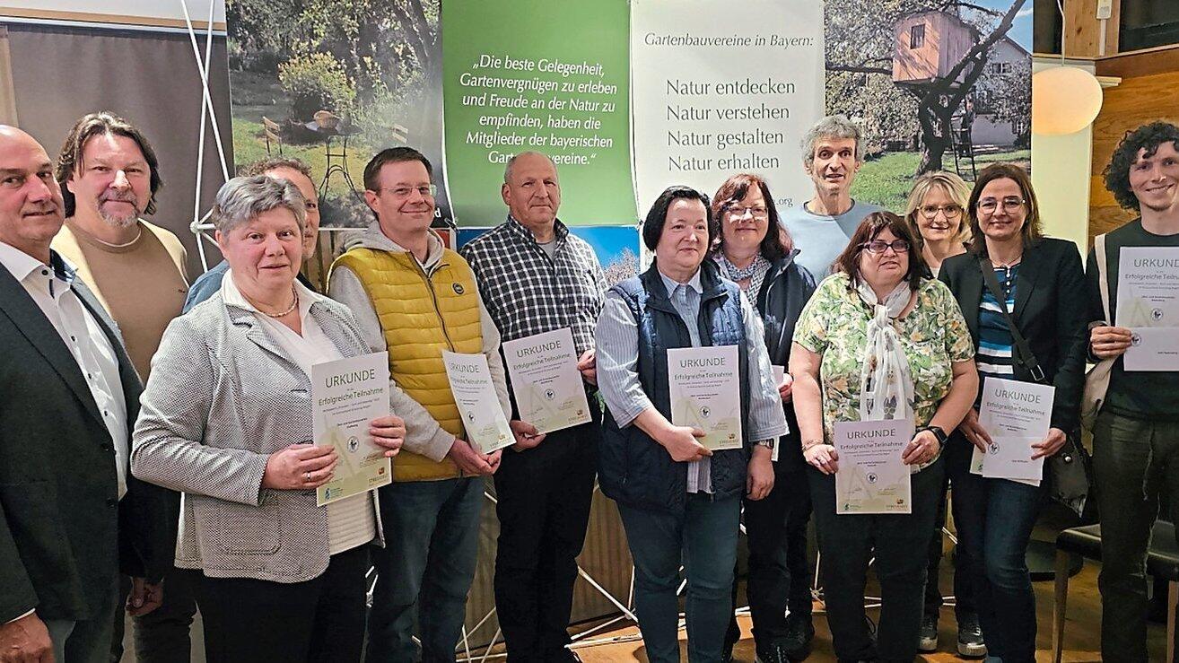 Kreisfachberater Stefan Heller, Referent Ralph Sturm (v. l.) und die Vertreter der Vereine, die über zwei Jahre am Streuobstwiesenwettbewerb dabei waren, mit Kreisfachberater Harald Götz und stellvertretende Kreisverbandsvorsitzende Regina Staudinger (stehend dahinter).
