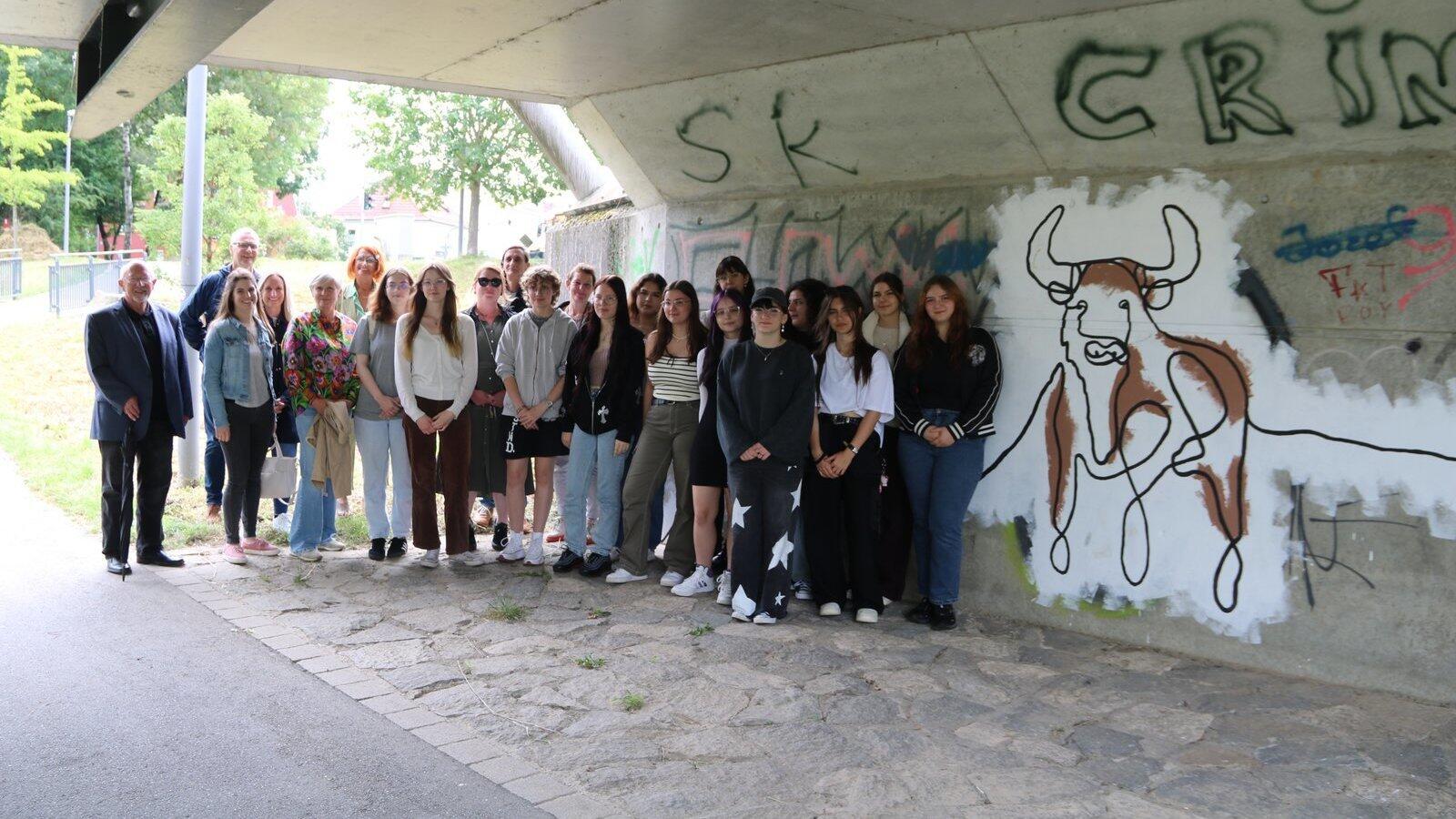 Die FOS-Schülerinnen mit (von links) Bürgermeister Werner Schäfer, Katrin Leibl, Marion Fischer, Jörg Bär und Cristina Pop von Kultur- beziehungsweise Tiefbauamt sowie Schulleiterin Sonja Padberg und den Lehrern Petra Lummer, Sasha Graza und Simon Fromm.