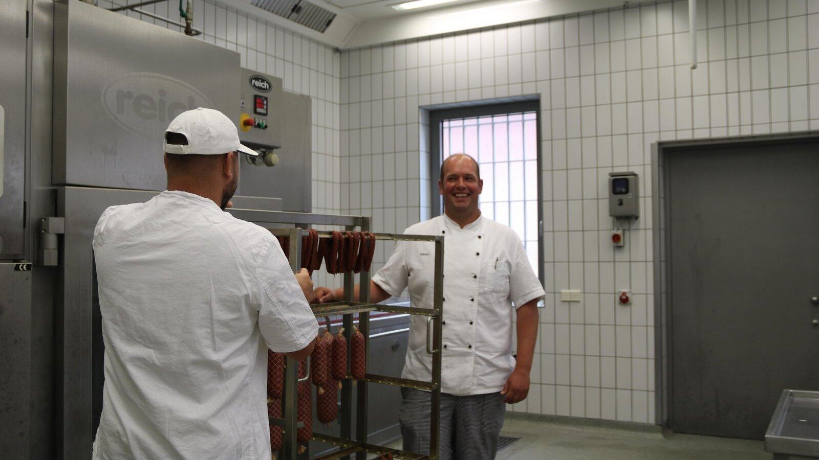 Zum zweiten Mal hat Michael Kötterl (rechts) mit seinen vier Mitarbeitern Salami hergestellt. Einer von ihnen ist Peter (Name von der Redaktion geändert), der bereits zum zweiten Mal in der Straubinger JVA sitzt.