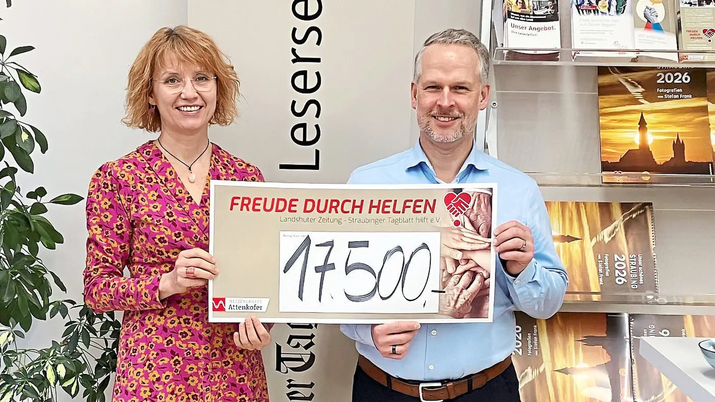 Eine rekordverdächtige Spendensumme in Höhe von 17.500 Euro konnte Tagblatt-Marketingleiterin Claudia Karl-Fischer von ihrem Kollegen aus der Vertriebsabteilung, Maik Fahrensohn, am Montag entgegennehmen. Die Summe wurde im vergangenen Jahr mit Hilfe der Advents- und Geschenkeabos der Mediengruppe Attenkofer eingenommen. „Dabei handelt es sich um die zweitgrößte Einzelspende nach dem Erlös aus dem Straubinger Adventskalender für unsere Benefizaktion Freude durch Helfen“, freute sich Claudia Karl-Fischer.