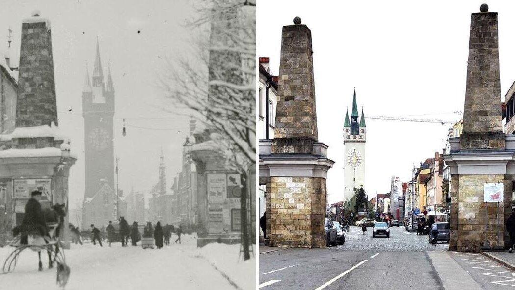 „Blick auf das Untere Tor“, 1916. Eine frühe Winterfotografie, als man noch mit Pferd und Kutsche fuhr (links). Und der Blick durch das Ludwigstor 100 Jahre später. Strenge und lange Winter gibt es laut Deutschem Wetterdienst nur noch selten. Auch in den kommenden Jahren.