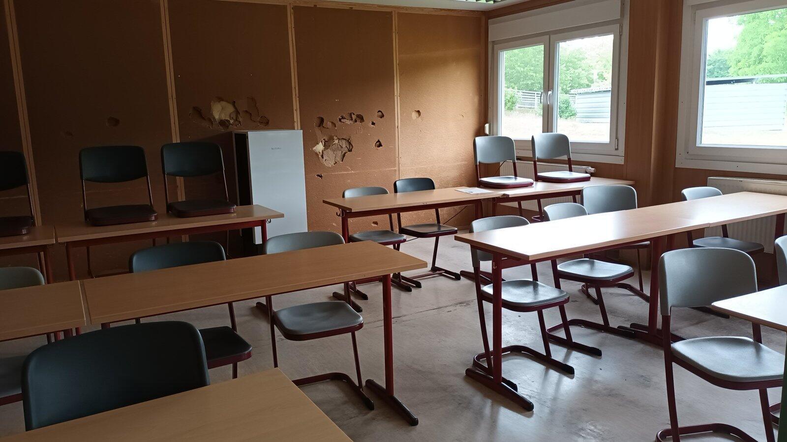 Blick in einen der Klassenräume der ersten Container-Anlage mit Fenstern, die sich nicht mehr öffnen lassen und deutlichen Gebrauchsspuren aus 15 Jahren Unterricht.