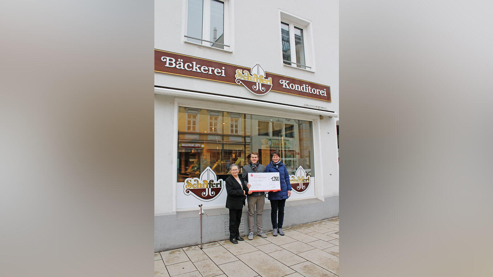 Irmgard Bräu (l.) nimmt mit großer Freude dankbar den Spendenscheck über 13 500 Euro von Junior-Chef Michael Schifferl und Filialleiterin Elke Liebl vor der "Gutes von gestern"-Filiale in der Bahnhofstraße entgegen.