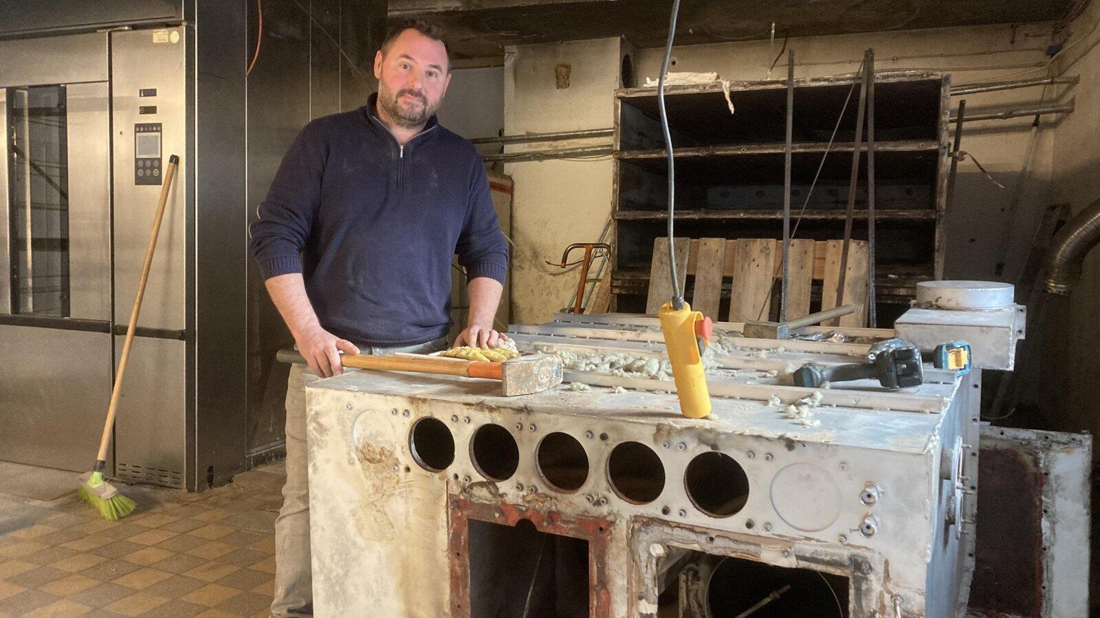 Bäckermeister Arthur Hartl zeigt den durch die Flammen zerstörten Backofen. Ein neues Gerät soll etwa 100.000 Euro kosten.