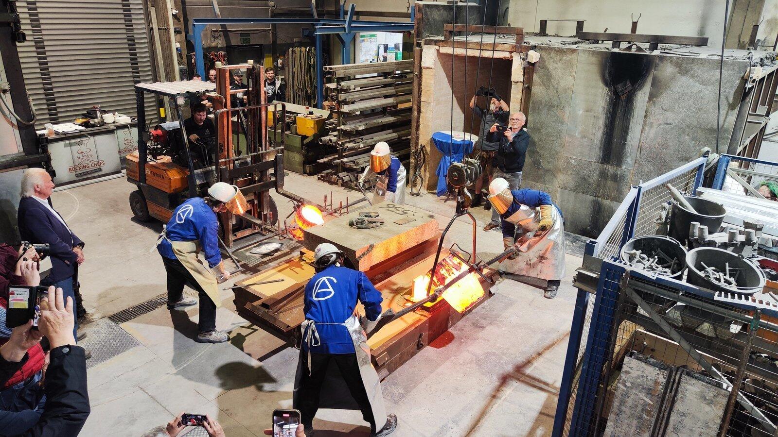 Hier wurde es heiß: Die Mitarbeiter der Gießerei Gugg gießen die Form mit dem Relief aus.