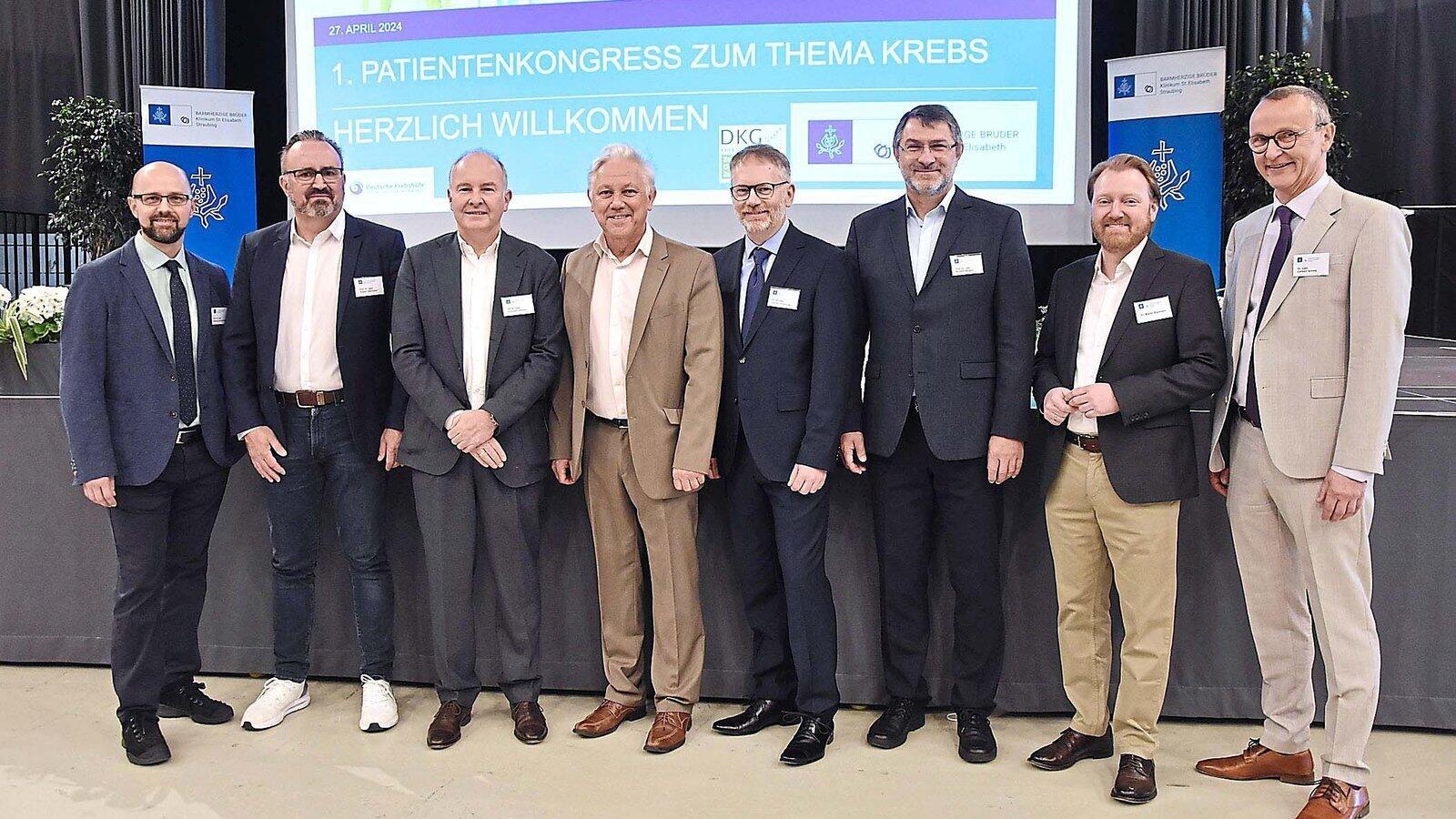 Die Leiter der zertifizierten Organtumorzentren am Klinikum St. Elisabeth stellten Diagnose- und Therapiemöglichkeiten vor: (v.l.) Prof. Antoniu-Oreste Gostian (Kopf-Tumor-Zentrum), Prof. Robert Obermaier (Darmzentrum), Privatdozent Dr. Christian Gilfrich (Uroonkologisches Zentrum)), Bürgermeister Dr. Albert Solleder, Privatdozent Dr. Jochen Grassinger (Onkologisches Zentrum)), Prof. Norbert Weigert (Darmzentrum), Dr. Martin Baumann (Geschäftsführer Klinikum) und Dr. Carsten Scholz (Gynäkologisches Krebszentrum).