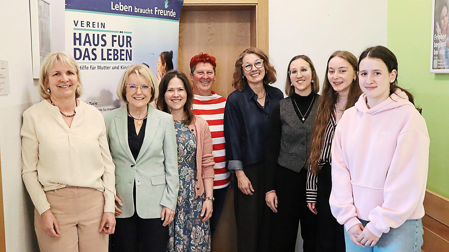 Zogen Jahresbilanz: Dr. Regine Langer-Huber (2.v.l.), Vorsitzende des Trägervereins Haus für das Leben, mit ihren Stellvertreterinnen Andrea Koch (l.) und Alexandra Göldner (3.v.l.) mit Erzieherin Petra Thalhofer (4.v. l.) und (daneben) den Sozialpädagoginnen Birgit Masur (Leiterin des Frauenhauses) und ihrer Stellvertreterin Katharina Gall sowie Praktikantinnen.