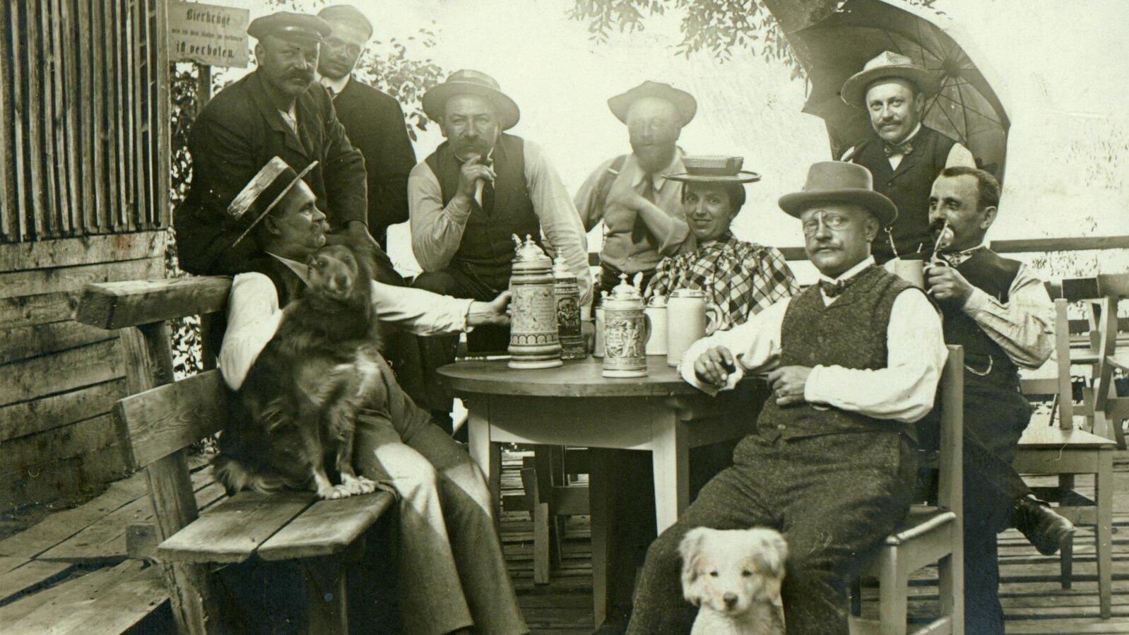 Das Biergartenverbot für Hunde wurde anscheinend manchmal nicht ganz so ernst genommen, wie hier auf dem Bild „Gesellschaft mit Hunden im Biergarten der Wundermühle auf dem Gstütt“ von 1910.