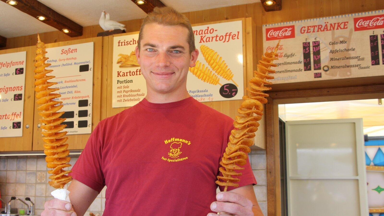 Markus Hoffmann von Hoffmanns Festspezialitäten mit zwei Tornado-Kartoffeln.