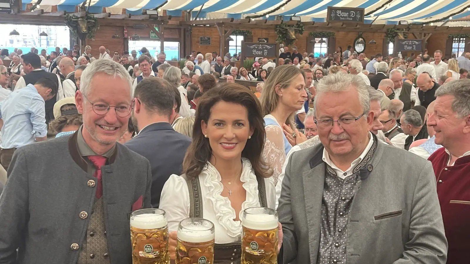 Stoßen zusammen auf ein schönes Gäubodenvolksfest an (v.l.): Straubings Oberbürgermeister Markus Pannermayr, Bayerns Landwirtschaftsministerin Michaela Kaniber und Straubing-Bogens Landrat Josef Laumer.
