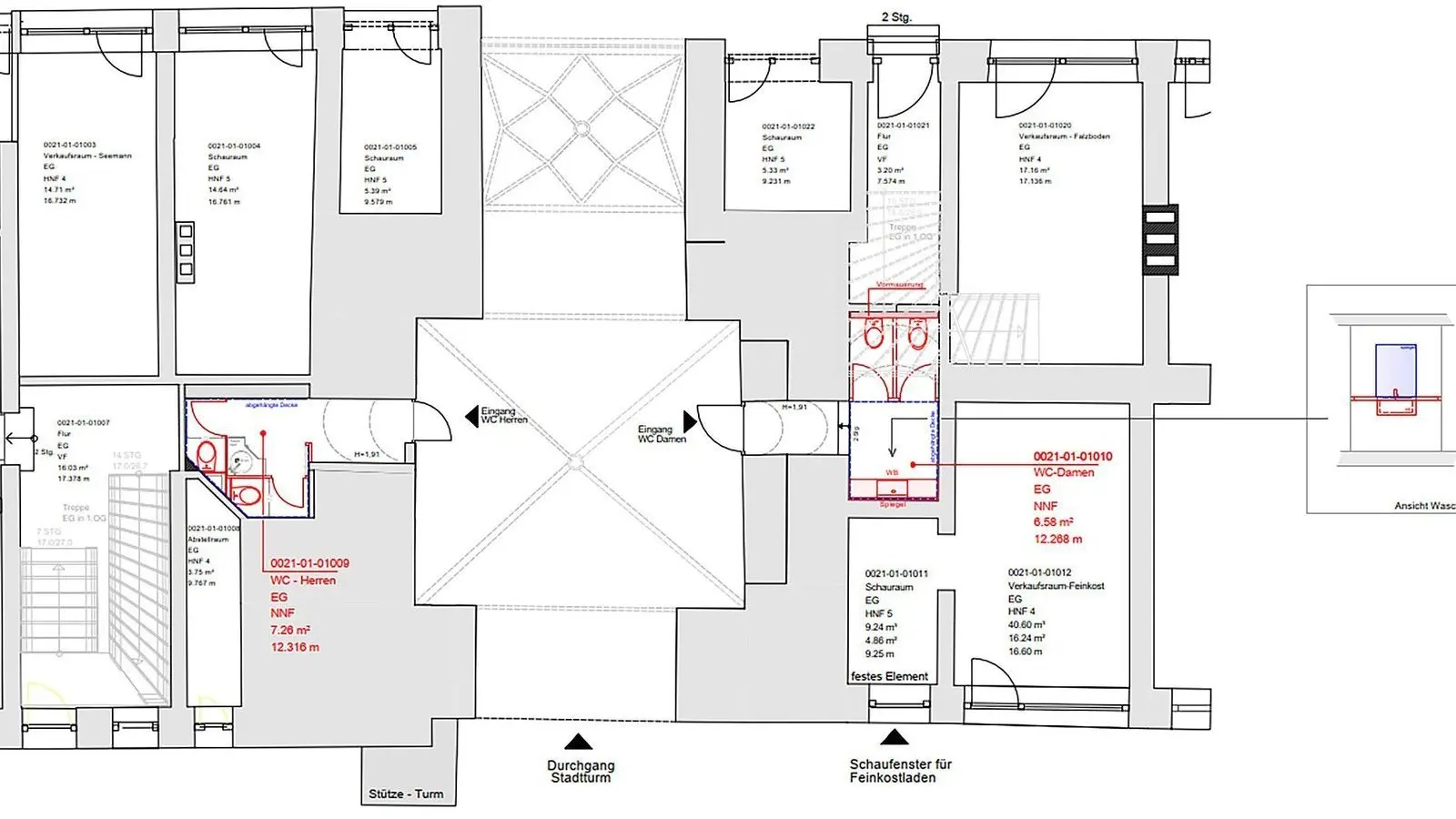 Mit 7,26 Quadratmeter für die Herren und 6,58 Quadratmeter für die Damen sind die beiden Toiletten nicht gerade überdimensioniert. Aber mehr Platz gibt es nicht, wie der Blick auf den Grundriss verrät.