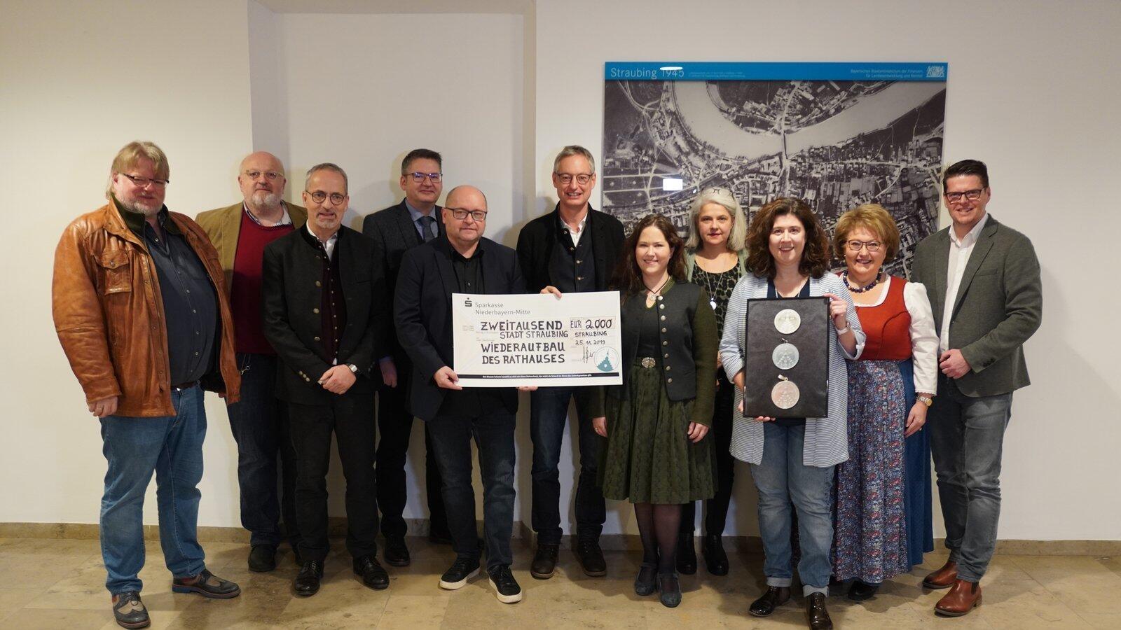 Jürgen Seissler (5. v. l.), Initiator des Rathaustalers, hat eine weitere Spende an Oberbürgermeister Markus Pannermayr (Mitte) übergeben. Er bedankte sich auch bei allen, die ihn von Anfang an unterstützt haben.