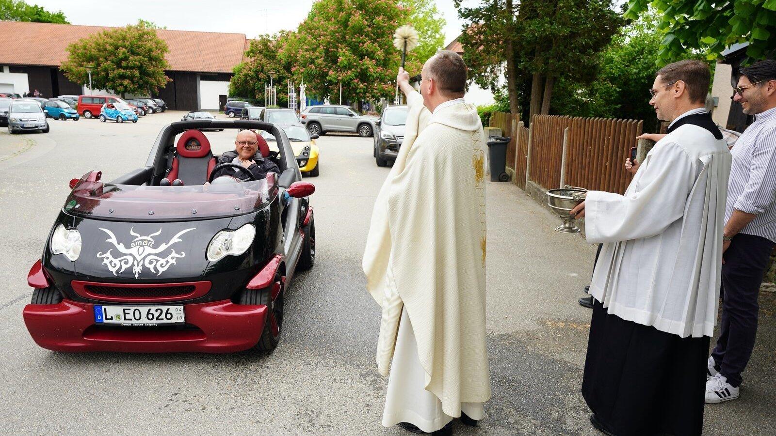 Bei der Fahrzeugsegnung oblag es Pater Martin, alle vorbeifahrenden Smart zu segnen.