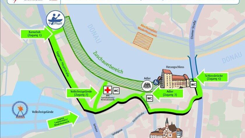 Zugänge zum Zuschauerbereich sind wie immer beim Kanuclub, hinter der Glaserei Kronacker, am "Adler" und an der Schlossbrücke. Die Zuschauerplätze sind wie gewohnt am Donauufer. Im Falle vieler Besucher werden einzelne Zugänge oder angrenzende Straßen komplett oder für kurze Zeit gesperrt. Wer das Spektakel von der Brücke aus beobachten möchte, sollte möglichst früh da sein.
