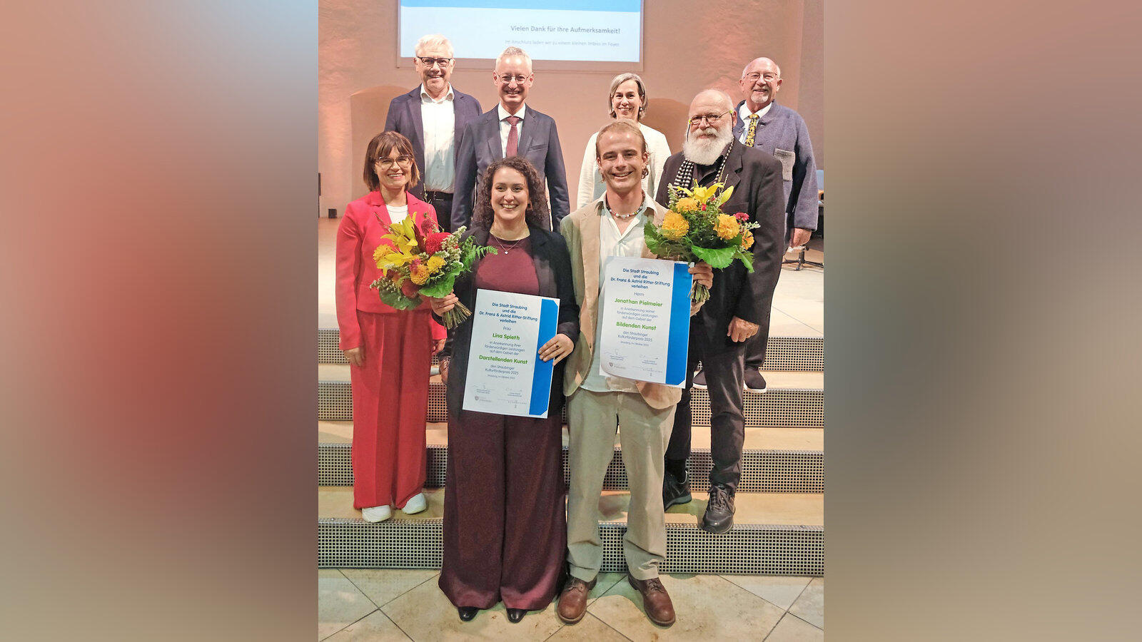 Die Preisträger Lina Spieth und Jonathan Pielmeier, umrahmt von ihren Laudatoren Claudia Brielbeck und Erich Gruber. Hintere Reihe (v.l.) Bürgermeister Dr. Albert Solleder, Oberbürgermeister Markus Pannermayr, Carolin Ahrendt von der Ritterstiftung und Bürgermeister Werner Schäfer.