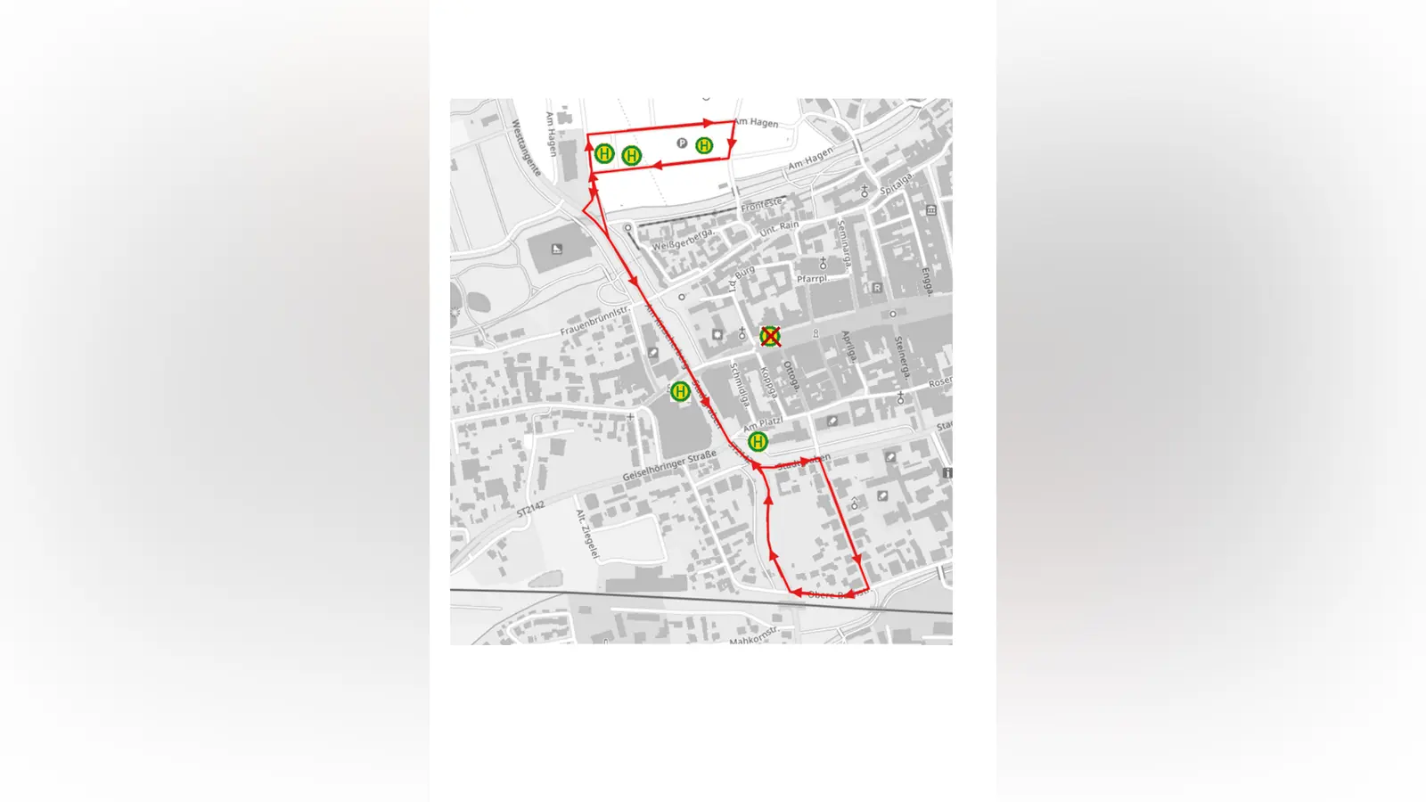 Der Pendelbus hält daher zukünftig an einer zusätzlichen Haltestelle am Stadtgraben: Am Kinseherberg – Stadtgraben – Wittelsbacherstraße – Obere Bachstraße – Unterführung Gabelsbergerstraße – Stadtgraben – Am Kinseherberg zurück zu den Haltestellen Am Hagen.