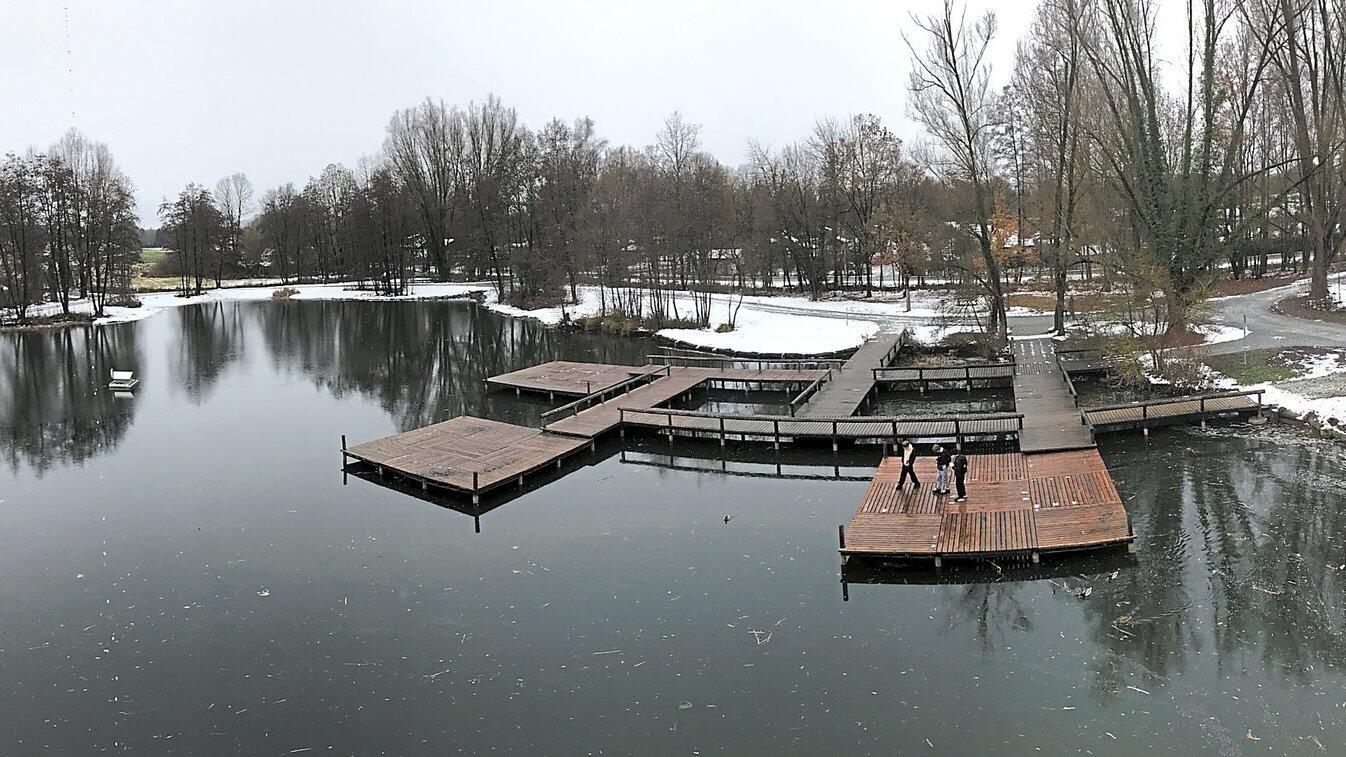 Der Eisweiher im Laga-Gelände ist in einer aufwendigen Aktion von Schlamm befreit worden und hat neue Uferbefestigungen bekommen. Die Uferbereiche dürfen aber noch nicht betreten werden, weil sie noch nicht fest sind.