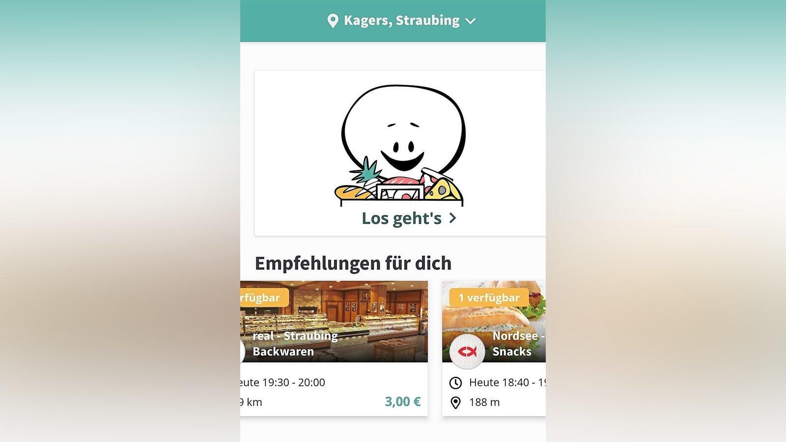 Die Ansicht der "Too good to go"-App auf dem Smartphone: Bei "Empfehlungen für dich" werden alle lokalen, noch verfügbaren Angebote angezeigt, wie Backwaren bei Real oder Fisch bei der Nordsee-Filiale.
