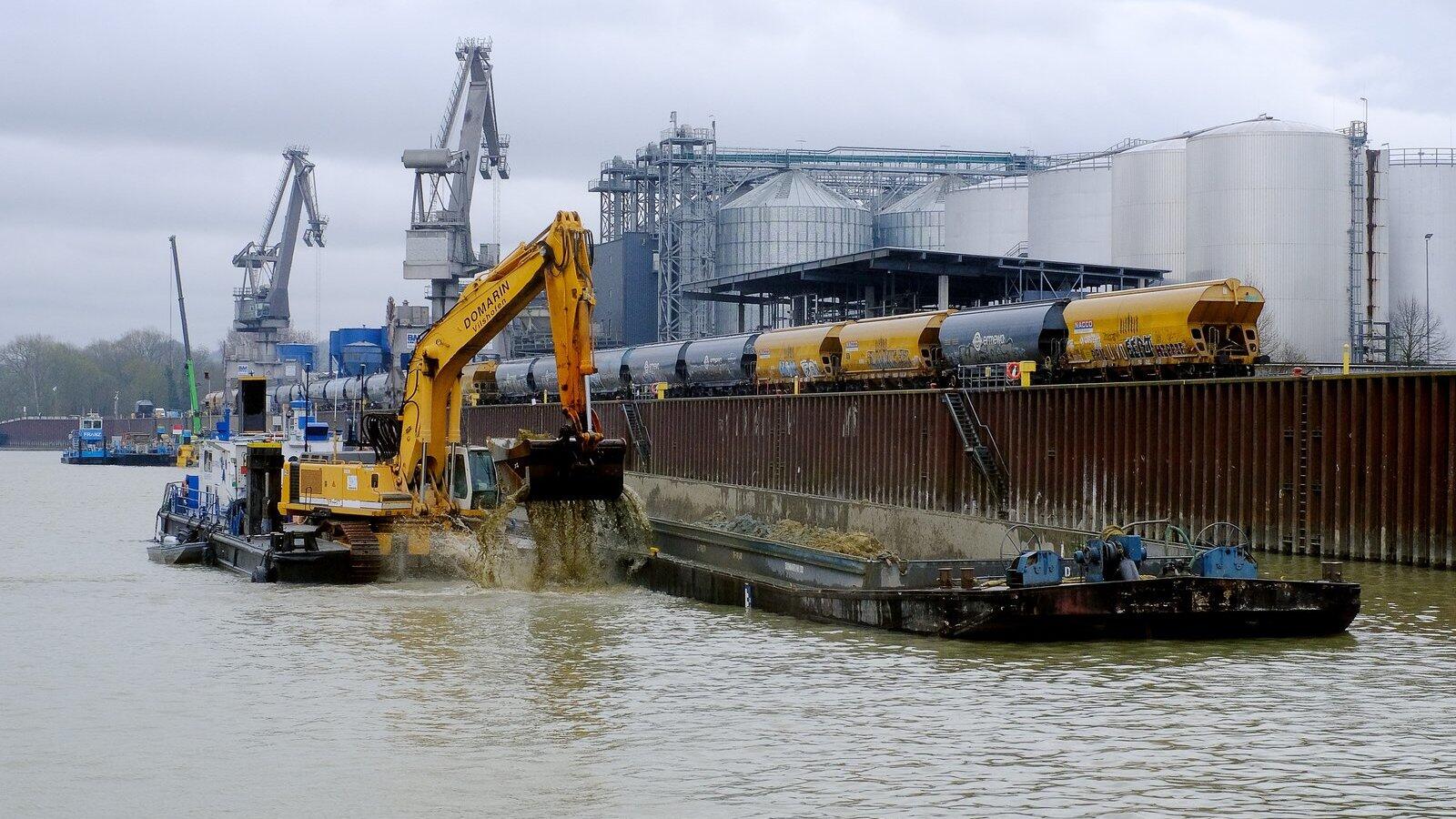Stahl, viel Stahl, Erde, viel Erde, Bagger, viele Bagger, Schiffe, viele Schiffe tanzen derzeit koordiniert ein schwimmendes Baustellenballett im Hafen Straubing-Sand.