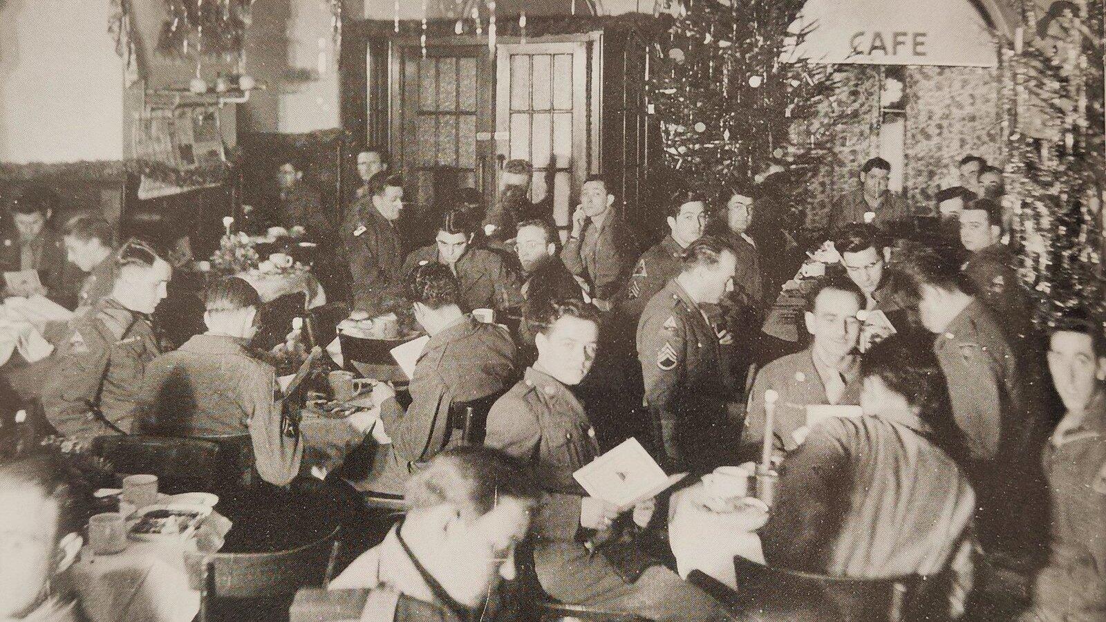 Amerikanische Soldaten feiern Weihnachten 1945 im beschlagnahmten Café Krönner bei Kerzenschein und Christbaumstimmung.