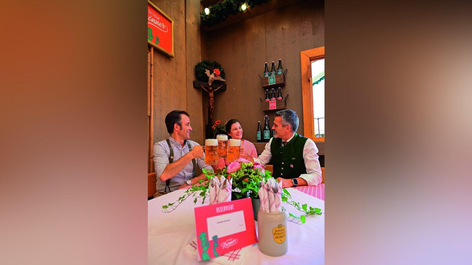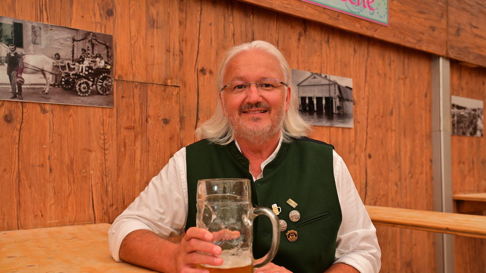 „Wir versetzen heuer unsere Fassade fünf Meter nach innen. Das Zelt wird somit kleiner, der Garten größer. Deshalb fällt der bisherige Stammtisch weg. Wir richten uns neben dem Festbüro im Hintergrund einen neuen Familientisch ein. Ein kleines Stüberl, wo wir uns auch mal in Ruhe besprechen können. Es wird unser gemütlicher Rückzugsort, weg vom Trubel. Der Herrgottswinkel gehört ebenso dazu wie ein Hirschgeweih und die hölzerne Eckbank in U-Form.“