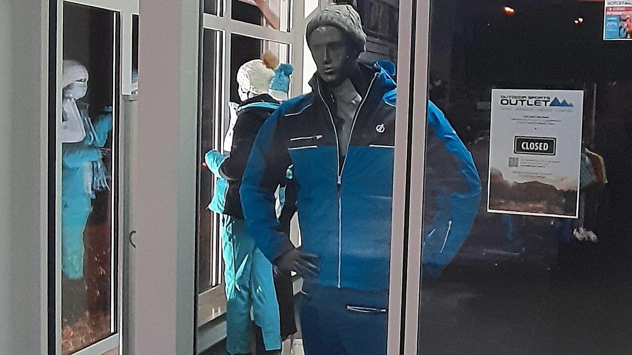 Den Eingangsbereich zieren vor verschlossenen Türen Schaufensterfiguren in Skibekleidung, daneben das Schild "closed".