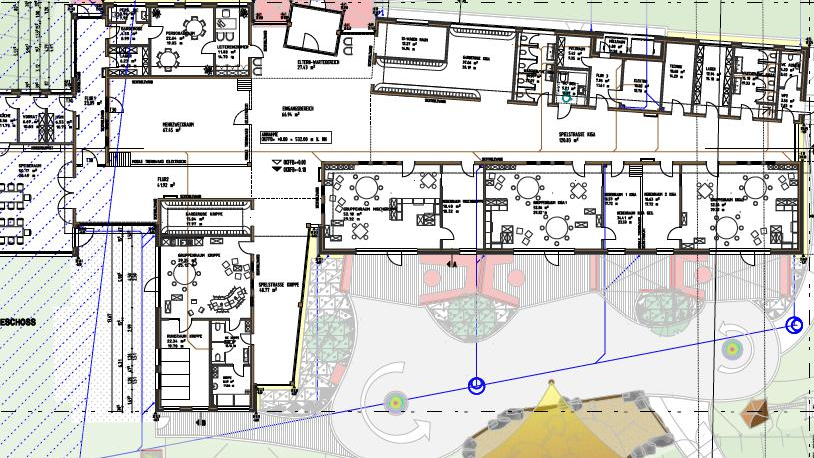 In dem ebenerdigen Gebäude des neuen Drachselsrieder Kindergartens sind Gruppenräumen für 90 Kinder, Essensraum und Nebenräumen untergebracht.