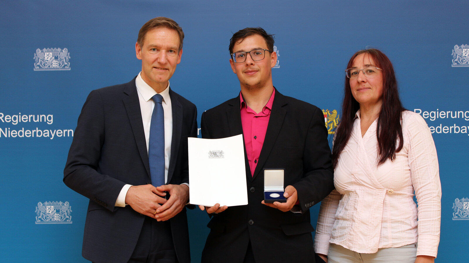 Für ihren Rettungseinsatz hat Regierungspräsident Rainer Haselbeck den 17-jährigen Johnathan Zejewski öffentlich gewürdigt und ihm die Medaille der Patrona Bavariae verliehen. Mit dabei war Mutter Karina Zejewski