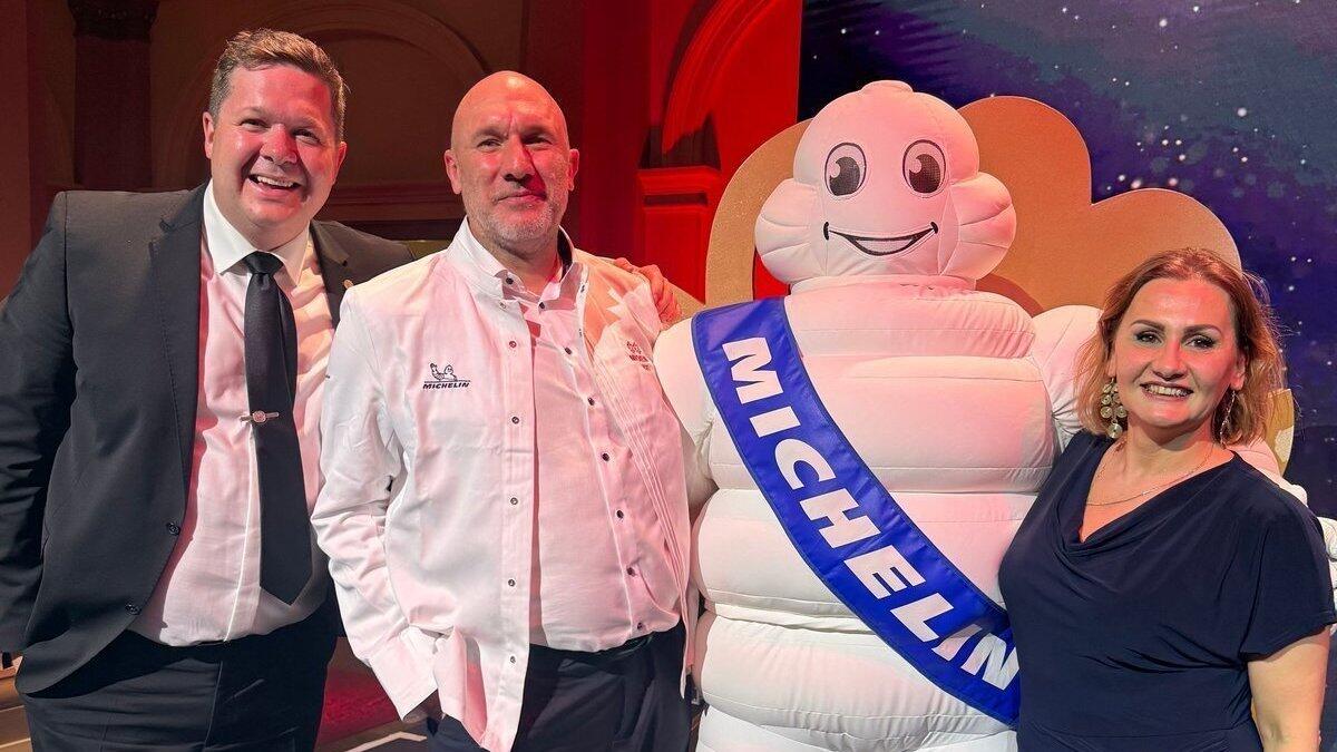 Hotelier Andreas Oswald, Küchenchef Thomas Gerber und seine Frau und gleichzeitig Kollegin, Filiz Gerber (v. l.), bei der Michelin-Stern-Gala in Frankfurt am Main.