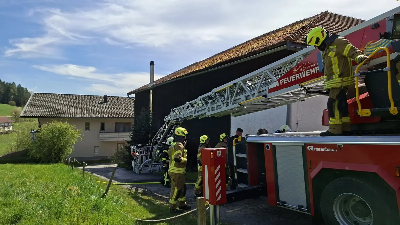 In Asbach (Landkreis Regen) ist am Montagnachmittag ein Scheunendach in Brand geraten. Grund dafür ist wohl Funkenflug durch einen Kamin. Dadurch entzündete sich auf dem Dach trockenes Moos.