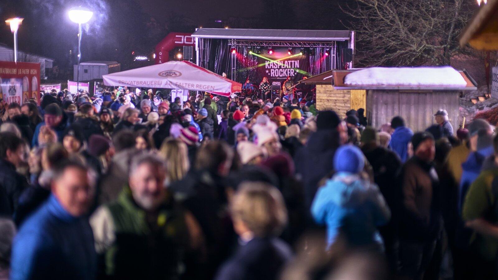 Nahtlos war der Übergang zur großen Après-Ski-Party, erst mit DJ-Musik und ab 19 Uhr mit der weitum bekannten Partyband „Kasplattnrocker“ aus Sankt Englmar. Bis kurz vor Mitternacht wurde der „ArberBlitz“ ausgiebig gefeiert. Fast 600 Besucher aus nah und fern strömten zur Partymeile am Bodenmaiser Hallenbad. Der Schiclub, die TSV Fußballer und Marcos Streetfood versorgten die Gäste an verschiedenen Verkaufsständen sowie an der Schneebar mit allerlei heißen und kalten Getränken sowie kulinarischen Schmankerl vom Grill. Zudem gab es tschechische und ungarische Spezialitäten wie Baumstriezel und Lángos, Kaffee und Kuchen und auch eine Losbude mit Preisen.