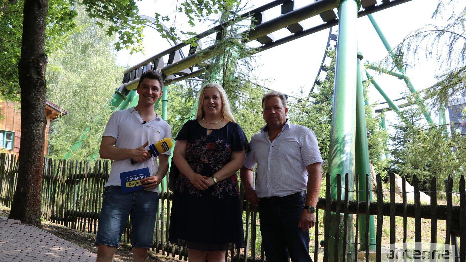 Mut und Reaktionsschnelligkeit für den guten Zweck: Bürgermeisterin Josefa Schmid (Mitte), Antenne Bayern-Redakteur Kevin Jackson (li.) und Walter Kagerbauer (re) vom Bayern-Park