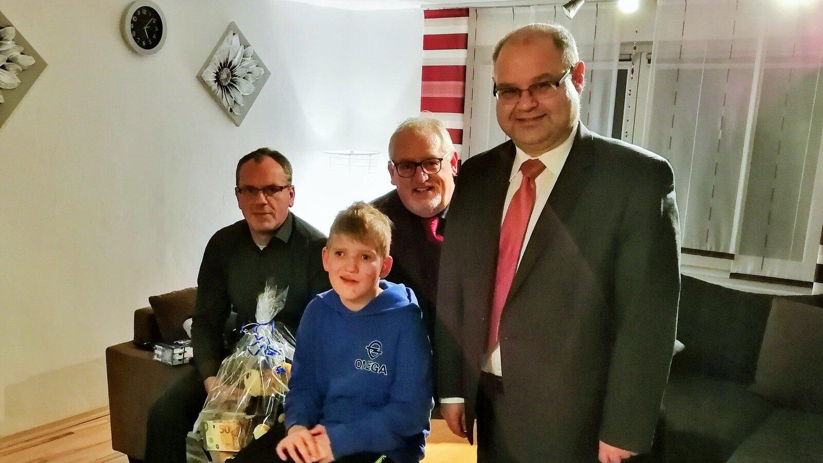 Spendenübergabe an den 10-jährigen Johannes Altmann mit Präsident Timo Payer (v.re.), Personalratsvorsitzendem Wolfgang Ulrich und Personalrat Thomas Loderbauer vom Bayerischen Polizeiverwaltungsamt.